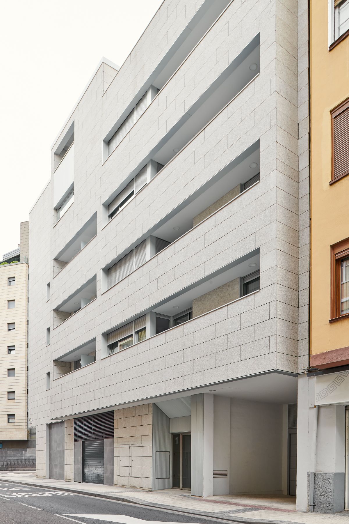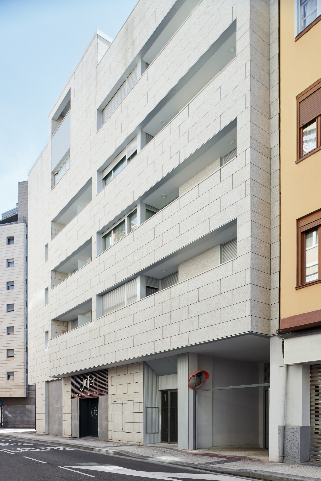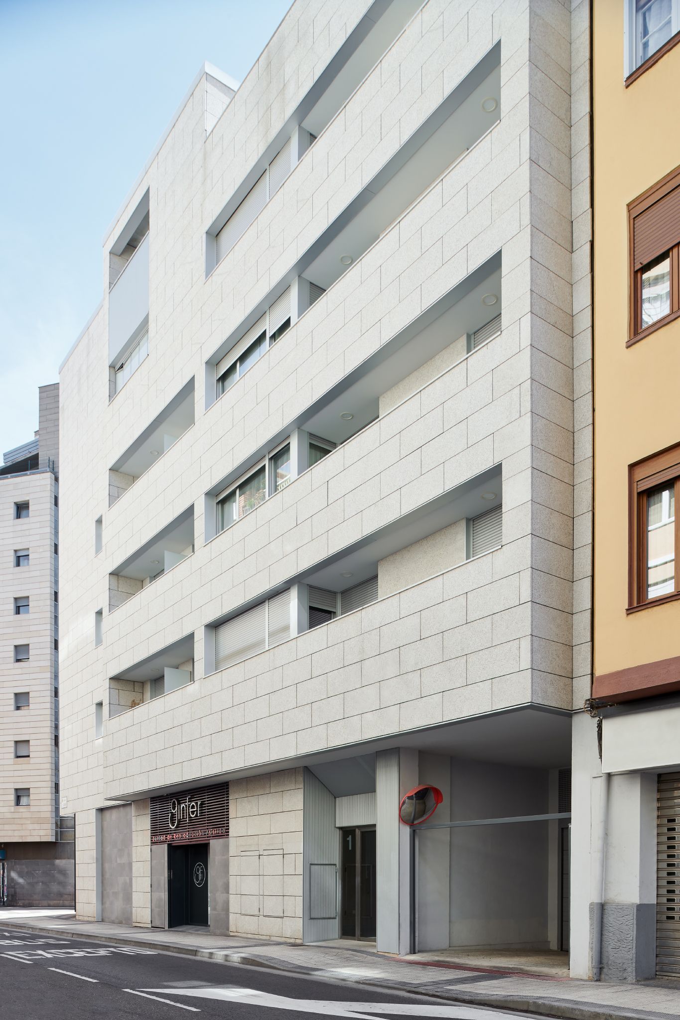 Esta promoción de 13 viviendas destaca por su innovador y moderno diseño y su fachada de granito silvestre.