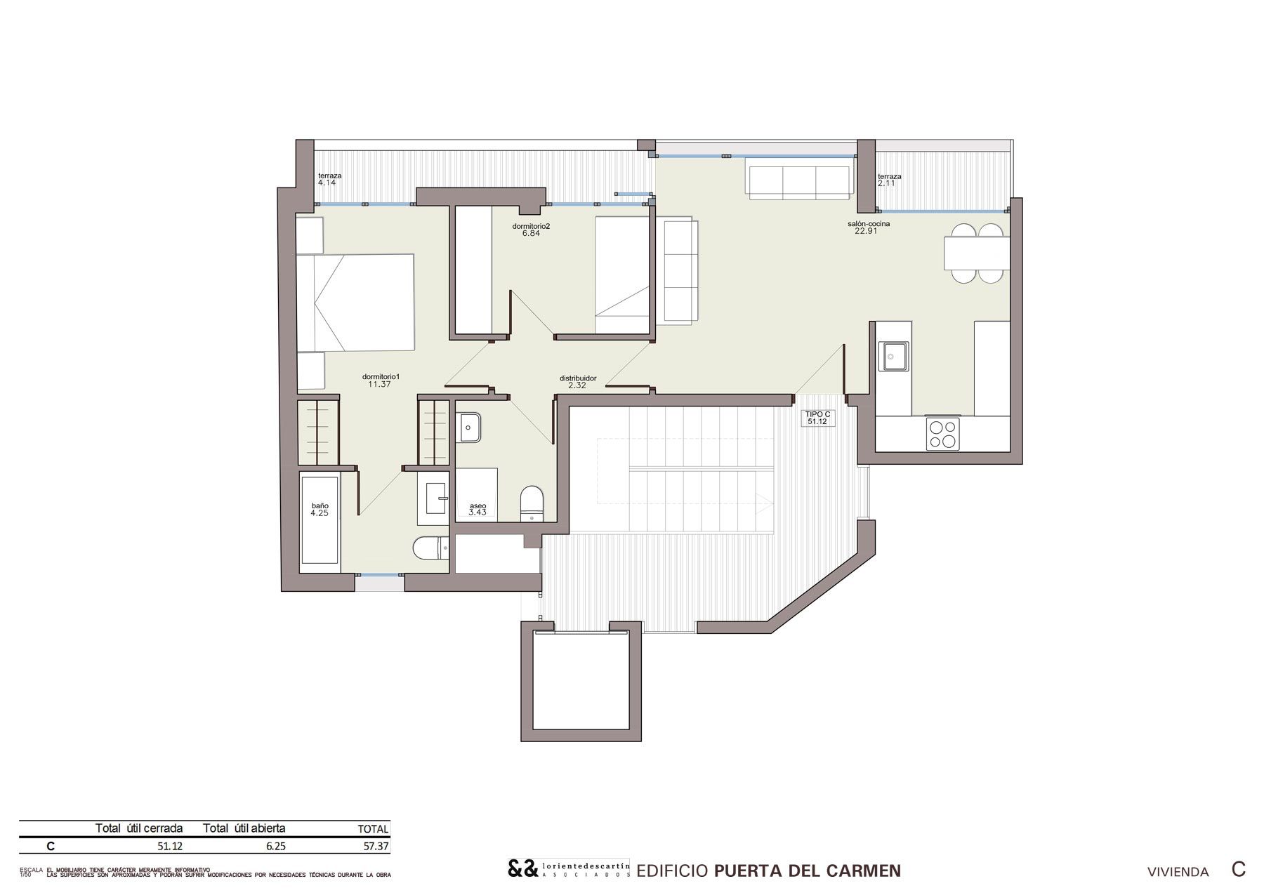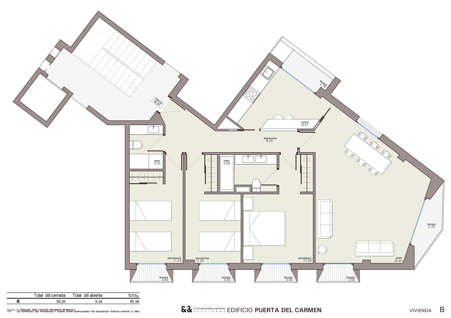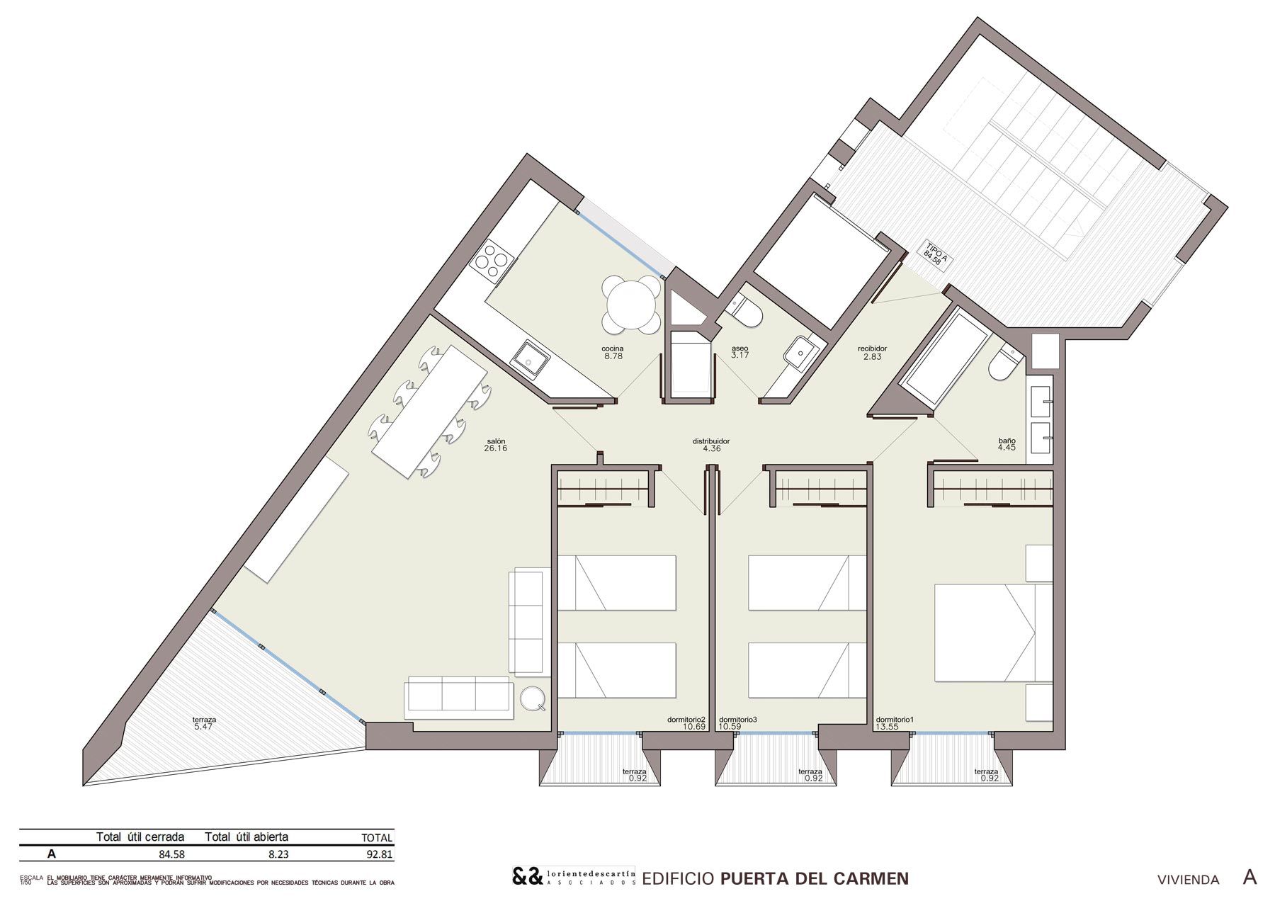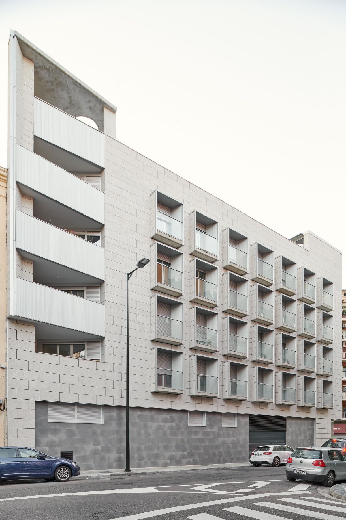 Las viviendas se reparten en 4 plantas alzadas, planta baja con portal de acceso y locales comerciales, y 2 plantas sótano con aparcamiento. La planta cubierta está destinada a superficie de solarium vinculada a las viviendas de última planta. Todas las viviendas disponen de trastero y algunas también de plaza de garaje.